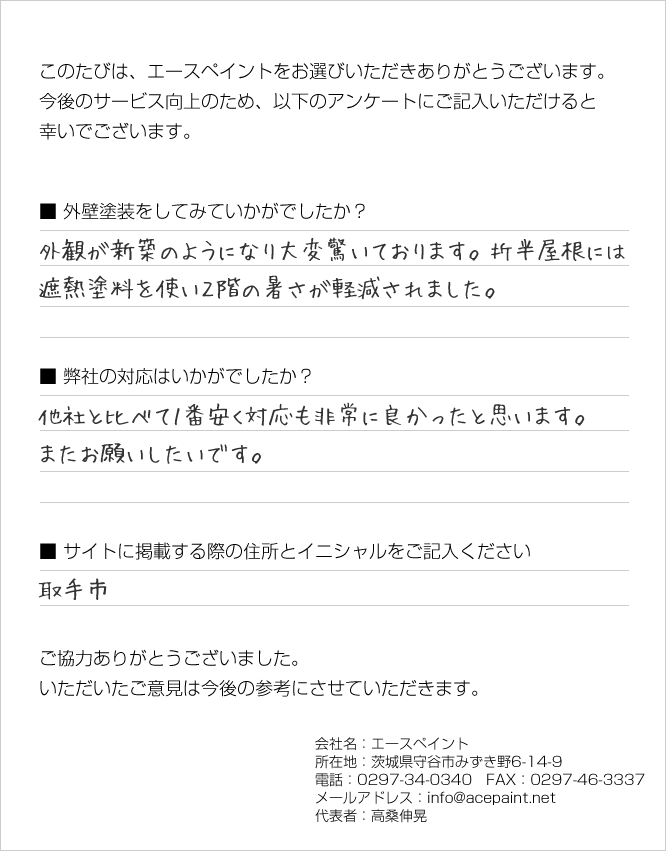 外観が新築のようになり大変驚いております。折半屋根には遮熱塗料を使い2階の暑さが軽減されました。他社と比べて1番安く対応も非常に良かったと思います。またお願いしたいです。